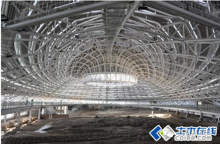2. 保护篷建筑为椭球体,结构中部为直径15m的“天眼”,长短轴之比为3.1,短轴最大跨度只有56m。