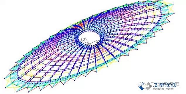 建筑的室内效果要求结构从天眼沿径向设置36榀平面径向桁架,利用“天眼”从脊到谷的内凹圆柱面设置高2.5m的内环桁架,在构造“天眼”局部结构的同时,也为整体钢结构提供了强有力的内部弹性支撑体系,增强了结构的整体稳定性,变不利因素为有利因素。径向桁架从支座到天眼内环桁架跨度由19~71m不等,且从短轴到长轴0.9~2.2m变高度布置。