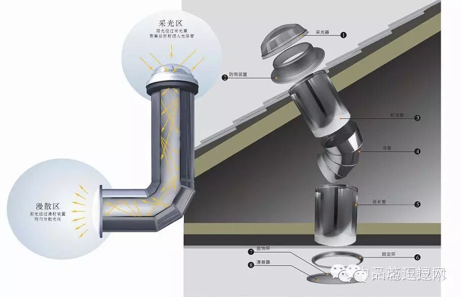 导光筒,利用高反射的光导管,将阳光从室外引进到室内,可以穿越吊顶,穿越覆土层,并且可以拐弯,可以延长,绕开障碍,将阳光送到任何地方。是一种绿色、健康、环保、无能耗的照明产品。
