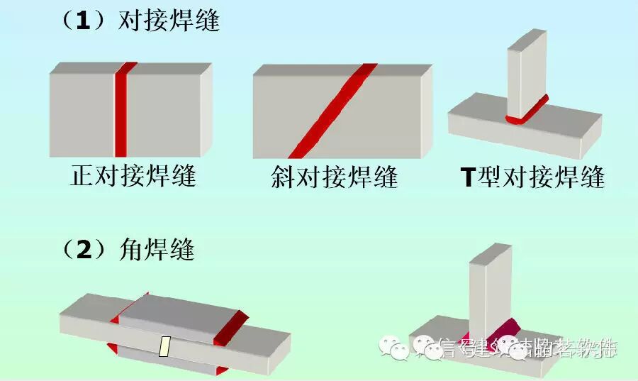 焊缝按板件连接形式可分为对接焊缝和角焊缝。其中对接焊缝又分为正对接、斜对接、T形对接焊缝。角接焊缝又分为搭接、角接、T形角接焊缝。