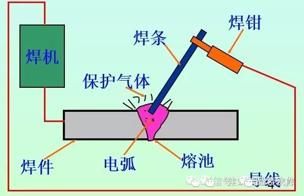 手工电弧焊以焊条与焊件各为一个电极,电弧引燃于其间,焊芯与工件的熔化金属形成焊缝金属,以此完成工件的焊接。