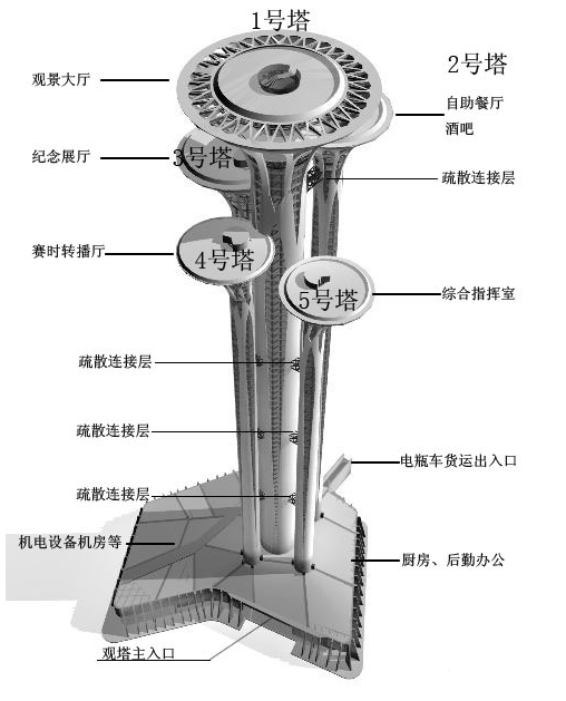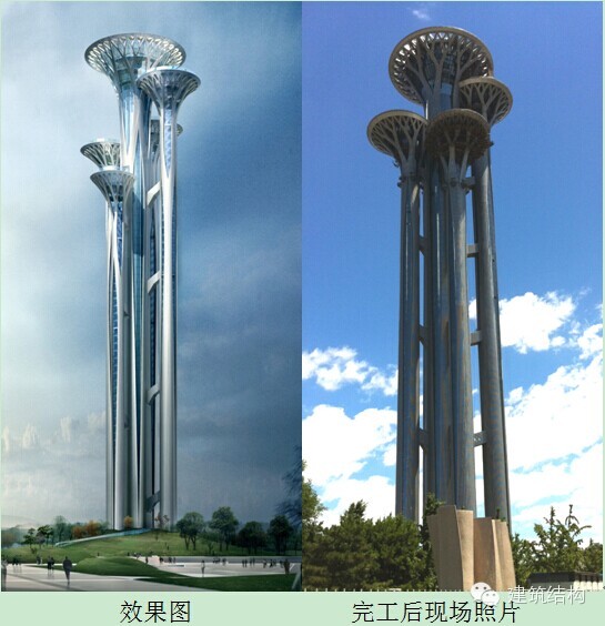 1号塔为主塔,位于中间,2~5号塔为副塔,围绕主塔周边,副塔与主塔的形心间距为15.1~19.17m。由于5个塔的塔身都非常纤细,1号塔轴线直径为14m,2号塔、3号塔均为7.3m,4号塔和5号塔直径仅为6.0m,单塔的最大高宽比达32。此外,塔冠直径达26.4~51.2m,观景厅的外挑长度很大。