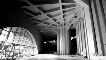 基座大厅大跨度屋盖采用围绕各塔放射形布置的交叉编织钢筋混凝土主、次梁-板结构。建成后,基座大厅清水混凝土构件的室内效果美观、大气。