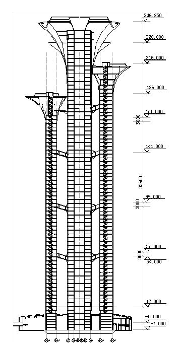 主塔由外筒与内筒组成,外筒由16根圆柱、外环梁及柱间支撑组成,内筒共有8根圆柱构成。副塔塔身均由6根圆柱、环梁及柱间支撑构成。180m标高以下采用钢管混凝土柱,混凝土强度等级C80~C50。180m标高以上采用纯钢管柱。外环梁采用H型钢,柱间支撑采用焊接箱形截面。