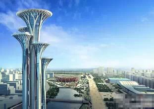该项目的建筑创意非常独特,5个单塔从基座向上延伸,利用幕墙的虚实变化,形成树干表面的机理,竖向构件在塔身顶部向外伸展、分叉,形成树冠,寓意“生命之树”。除了其使用功能以外,该建筑本身也是奥运公园中的一个独特景观。