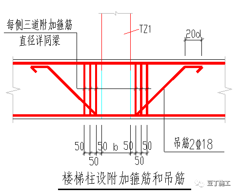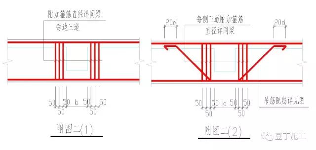 2、主次梁交接处未特别注明者均按照附图二要求配置附加横向钢筋: