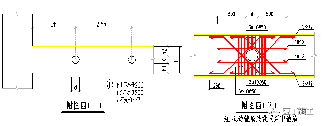 8)矩形洞边长和圆形洞直径大于300但不大于1000时补强钢筋构造: