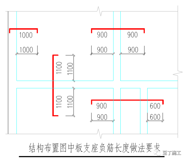 (1)板的底部钢筋,短跨钢筋放下排,长跨钢筋放上排,并尽可能沿板跨方向连跨通长配置。板面钢筋在角部相交时,短跨钢筋放在上排,长跨钢筋放在下排。底部钢筋需要截断时断点应设在支座处。
