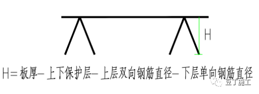 (4)绑扎一般用八字扣,除外围两根筋的相交点全部绑扎外,其余各点可隔点交错绑扎(或全部绑扎)。如板为双层钢筋,两层筋之间须加钢筋马凳以确保上部钢筋的位置。为确保上部钢筋的位置,在两层钢筋间加设马凳铁间距800mm。 h=楼板设计厚度—上下保护层—上层双向钢筋直径—下层单向钢筋直径。