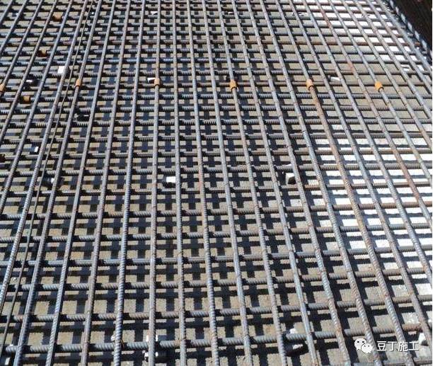 (5)绑扎负弯矩钢筋,每个扣均要绑扎。绑扎时在负弯矩筋端部拉通长线进行就位绑扎,保证钢筋端部平齐,在同一条直线上。楼板钢筋保护层采用混凝土垫块间距800mm呈梅花型布置。