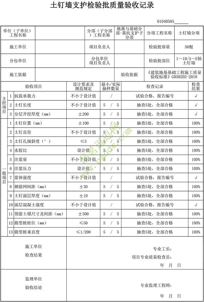 土钉墙支护检验批质量验收记录填写说明
