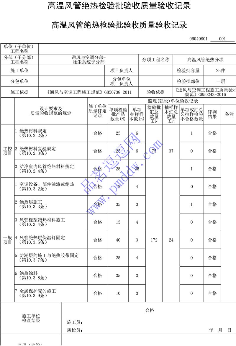 高温风管绝热检验批验收质量验收记录填写说明